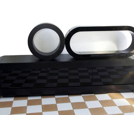 Aparador Oval em Carvalho pintado em wengue 8, com portas lacadas a alto brilho e puxadores em Craclet.
